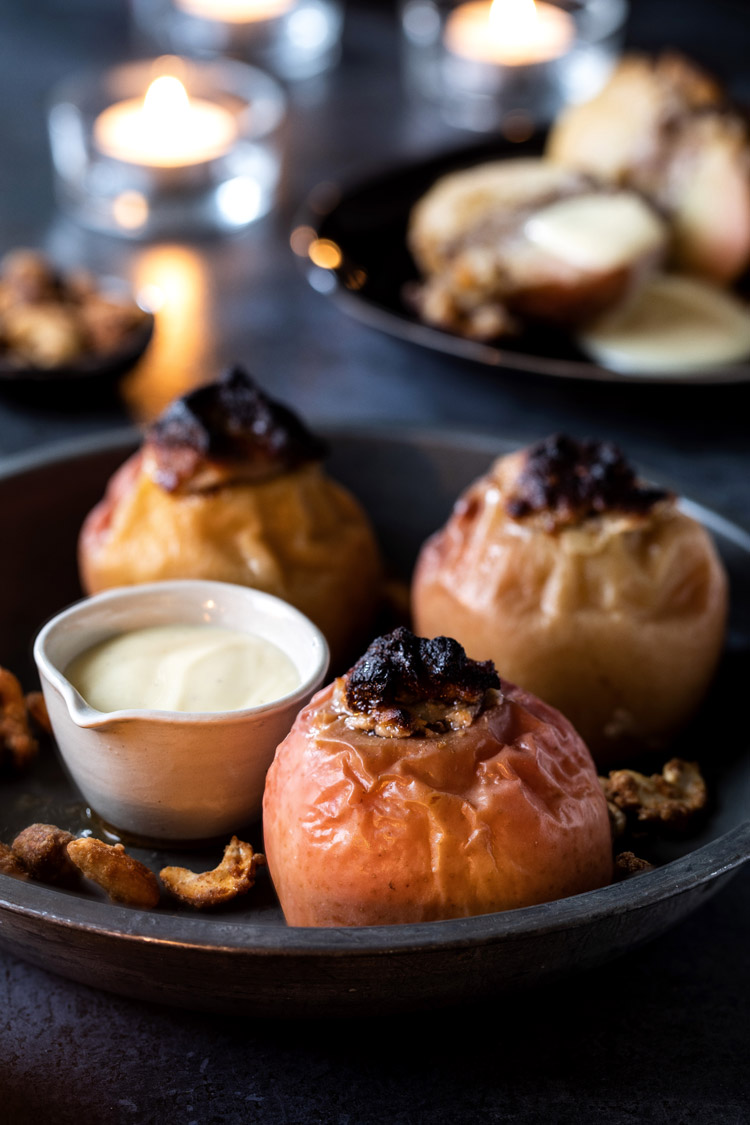 Die Bratäpfel mit der Apfel-Honig-Sauce beträufeln und mit Vanillesauce oder -eis genießen.